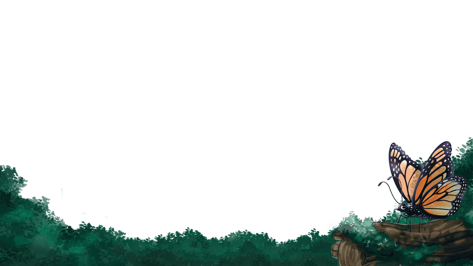 Just past Unicorn Meadow and Dragon Rock, you'll see a giant monarch chirruping happily and gently fanning her wings on a log.